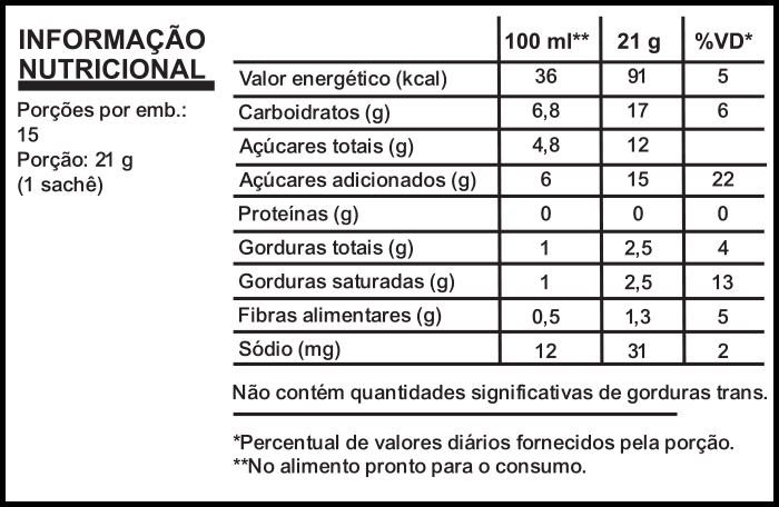Açúcar, creme de leite não lácteo (sólidos de xarope de glicose, gordura vegetal, caseinato de sódio (proteína do leite), hidrogenofosfato de sódio E340(ii), tripolifosfato de sódio E451(i), mono e diglicerídeos de ácidos graxos E471, ésteres de ácidos graxos do ácido diacetiltartárico, dióxido de silício E551, betacaroteno E160a(i)), café instantâneo.